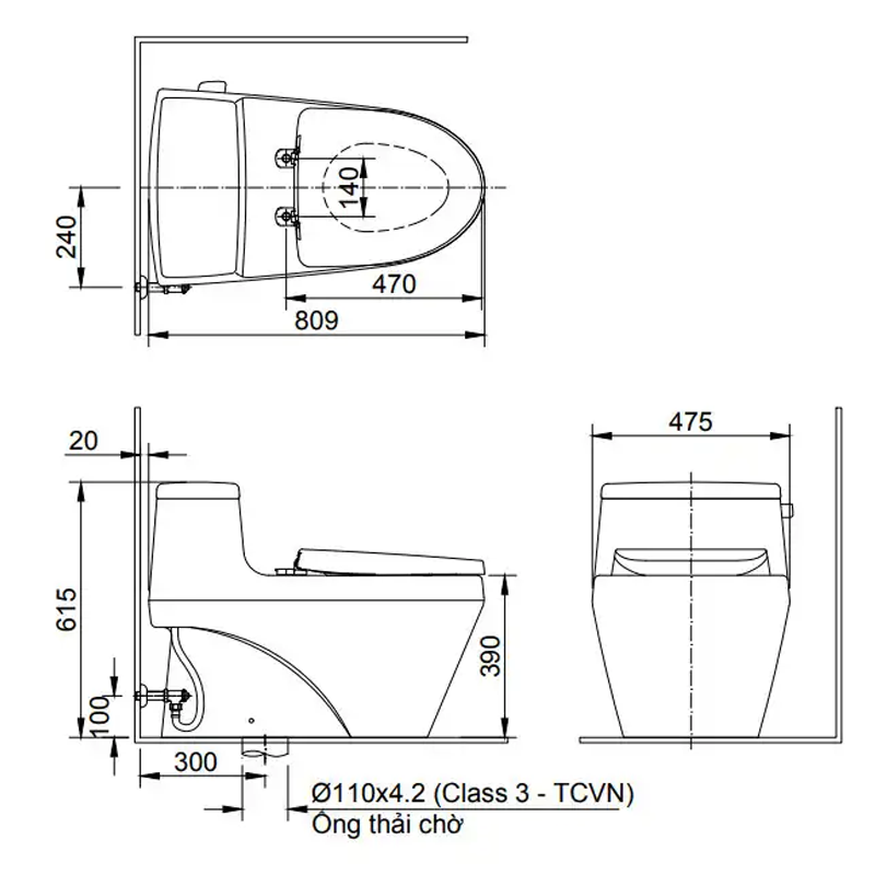 Kích thước bồn cầu: 809x475x615 mm (DxRxC)