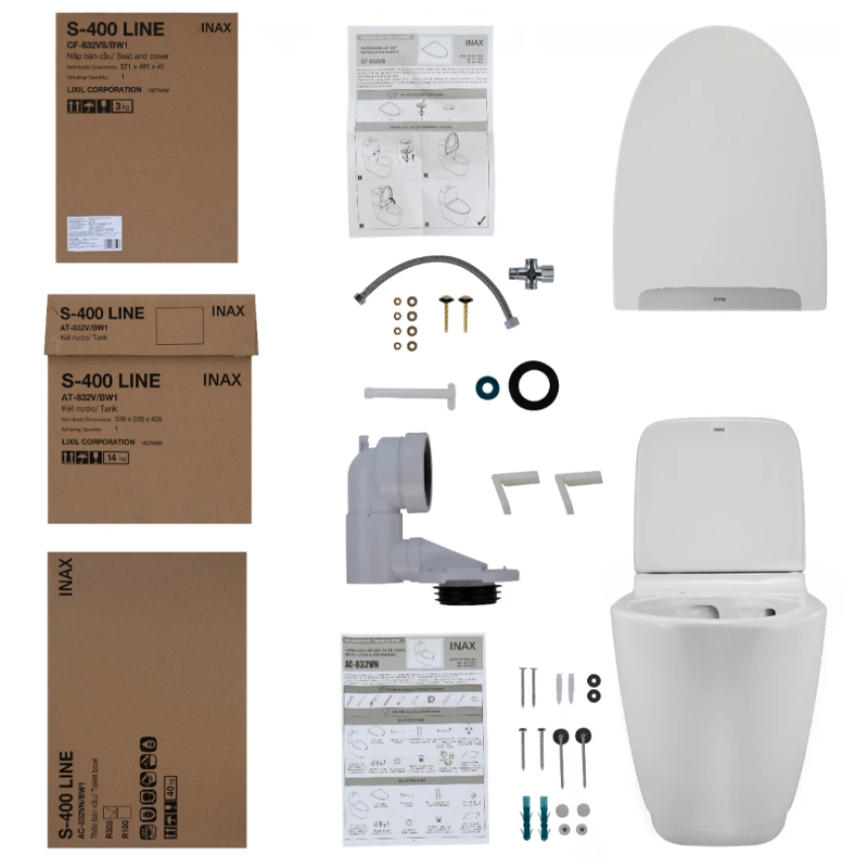 Bao gồm: Thân cầu AC-832VN, két nước AT-832, nắp đóng êm CF-832VS, van khóa A-703-7, dây cấp nước