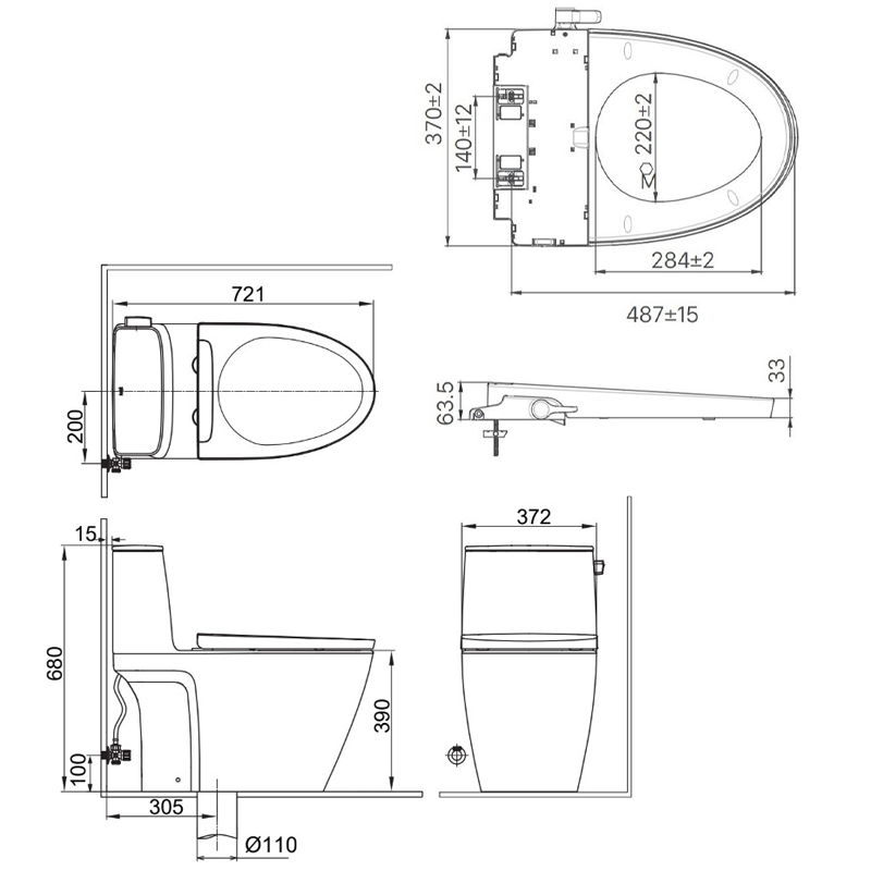 Kích thước bồn cầu: 721x372x680 mm(dài x rộng x cao)