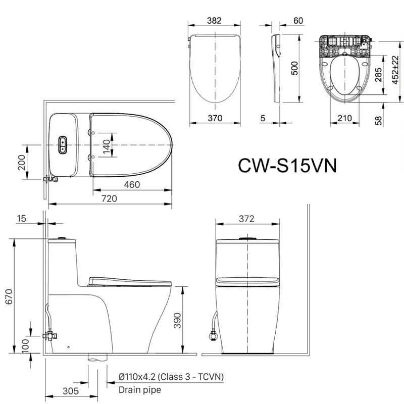 Kích thước nắp rửa cơ CW-S15VN: 500 x 370 x 60 mm (dài x rộng x cao)