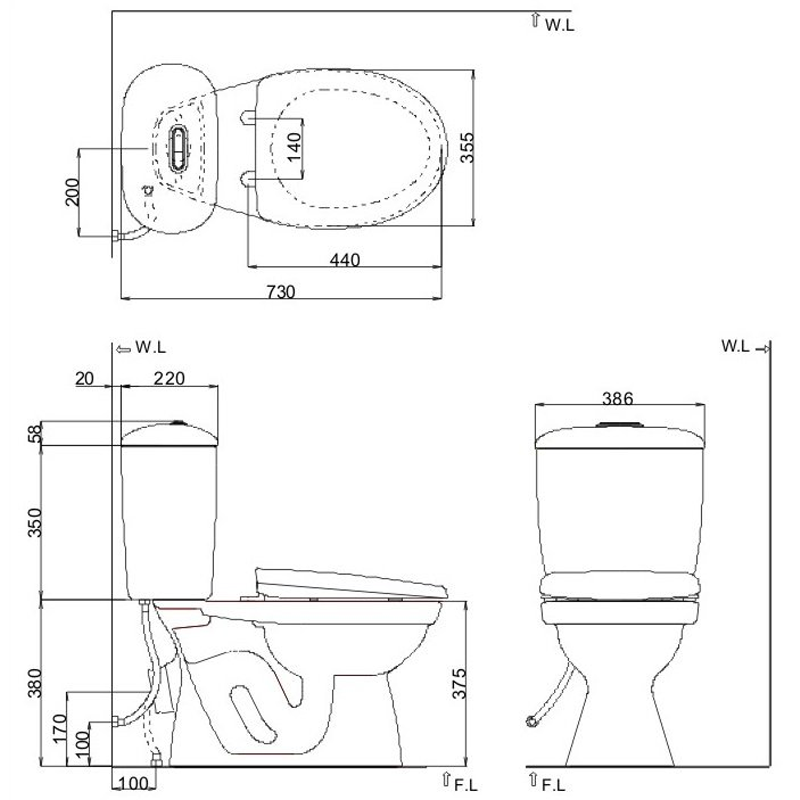 Bản vẽ kỹ thuật bệt vệ sinh 2 khối thoát ngang INAX C-306VPTN nắp êm