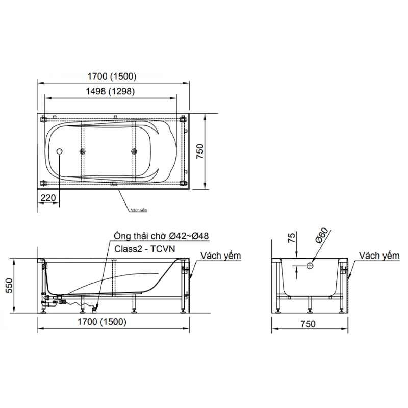 Loại: Bồn tắm chân yếm, không cần ốp gạch