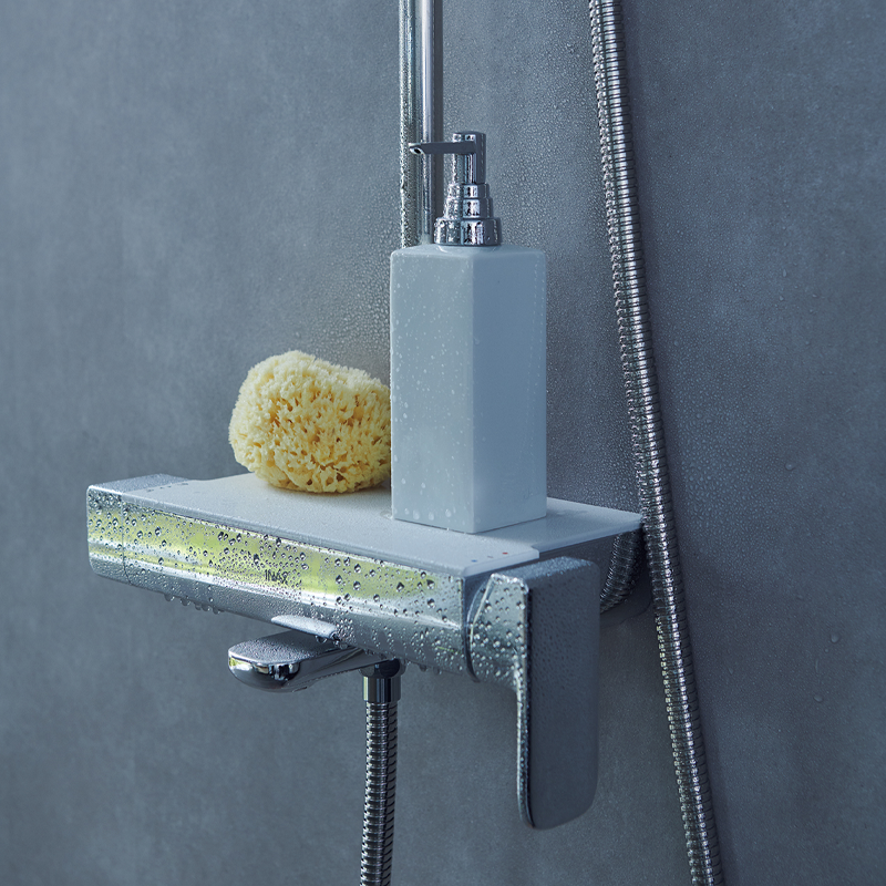 Phần thân sen tích hợp khay để đồ, vừa tiện dụng vừa tiết kiệm diện tích phòng tắm.