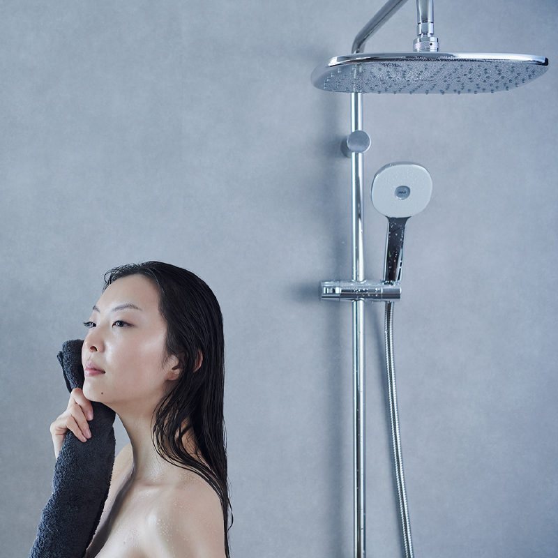 Bát sen lớn trên cao, tạo dòng nước bao trọn cơ thể, mang đến cảm giác thư giãn như tắm mưa tự nhiên.